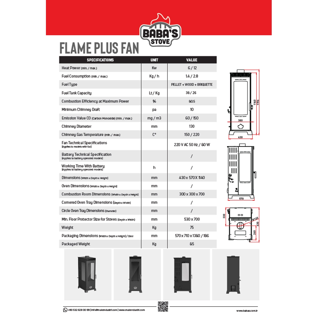 § Flame Plus Fan 12 KW: Üç camlı bir yapıya sahiptir ve fanlıdır. Fan sobanın çalışması için gerekli değildir. Amacı sobanın üzerinde biriken sıcaklığın ortama hızlı bir şekilde dağılımını sağlamaktır. Kullanımı opsiyoneldir.